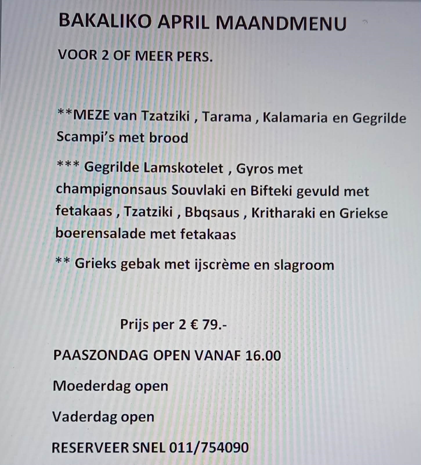 1 MEI en 10 Mei MOEDERDAG OPEN !! Reserveren kan via 011/754090 of sms whatsApp 0478/605828 , Bij reservatie via mail ff in de spambox kijken voor bevestiging BAKALIKO